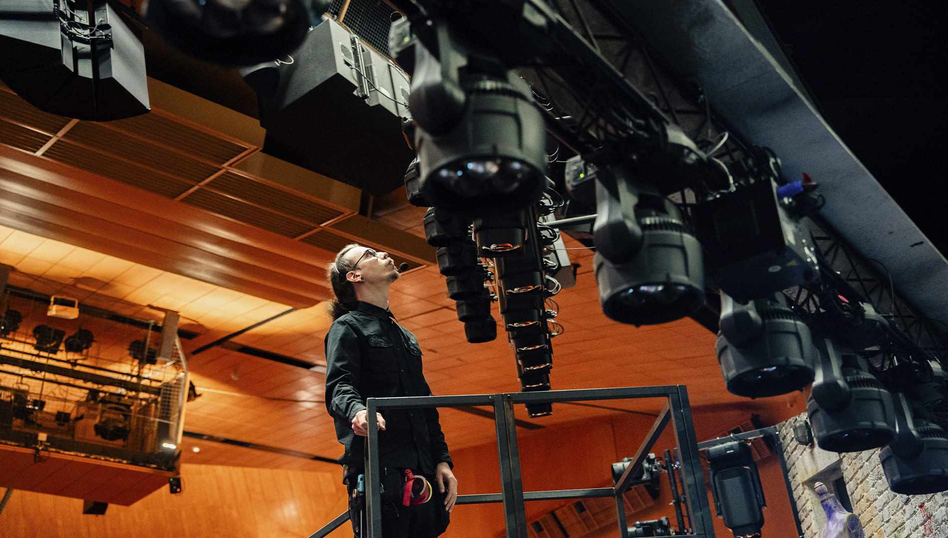 “Förutom att allt gärna ska vara klart samtidigt och i förrgår, så är det nog när de vill ha väldigt mycket extra. Det handlar inte om att det är svårt, det handlar mer om tidsåtgång. Vi har en grundrigg, som vi i princip kan starta upp och använda utan förberedelse. Utöver det kan vi hänga extra grejer i riggen. Och utöver det kan vi använda oss av sidostående ljustorn, så kallade balettorn. Vi har extra rökmaskiner och extralampor på rullvagnar. Ju fler saker vi har på golvet, desto mer förberedelsetid är det. Så förberedelser för oss på ljuset inför en föreställning kan vara allt mellan en halvtimme och två och en halv timme, beroende på vad ljussättaren vill använda.